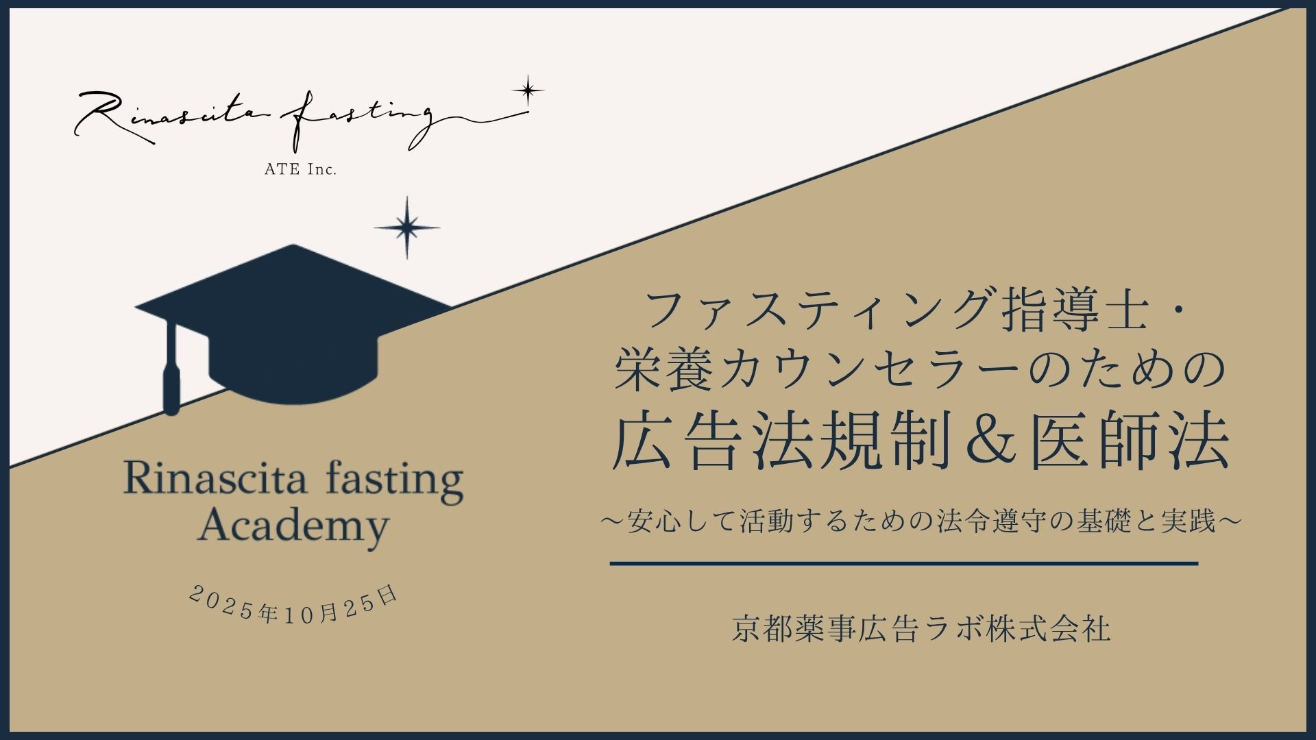 実施概要 株式会社ATE主催、Rinascita fasting依頼のもと、ファスティング指導士や栄養カウンセラーとして活動される事業者向けのオンラインセミナーを実施いたしました。 ファスティング指導士育成アカデミーRFA - Rinascita fasting 本セミナーは、健康関連ビジネスに携わる専門家が抱える「正確な情報発信と法規制遵守」という重要な課題に対する実践的なソリューションを提供しました。 セミナー概要 開催形式: Zoomウェビナー 実施時間: 2時間 対象者: ファスティング指導士、栄養カウンセラー、健康関連事業者 参加形態: 講師陣を含む企業・団体単位での参加 セミナーが解決する課題 健康食品やファスティング指導の領域では、薬機法・景品表示法・医師法といった複雑な法規制が関わってきます。これらの法規制を正確に理解し遵守することは、事業者にとって必須の知識です。 しかし多くの事業者は以下のような課題を抱えています: 広告表現が法に触れていないか判断が難しい 社内研修では専門的な解説が充実していない 法規制の改正情報をどのように取り入れるか分からない 安心して活動するための実践的な知識が不足している 本セミナーは、これらの課題を解決し、事業者が安心して正確な情報発信を行うための知識と実践スキルを習得することを目指します。 セミナー内容紹介 1. セルフ発信チェック 参加者が自社の広告表現や情報発信について、実際に法規制に基づいたチェックを行うセッション。実践的な視点から、現在の発信内容の問題点や改善点を認識するきっかけとなります。 2. 法規制を守る理由の理解 単に「法規制を守らなければならない」という義務的な理解ではなく、なぜそのルールが存在し、それが消費者・事業者双方にどのような影響を与えるのかを理解します。このセクションにより、参加者の法規制遵守に対するモチベーションが大きく向上します。 3. 薬機法についての詳解 医薬品、医療機器、化粧品、サプリメントなどの販売・広告において最も重要となる薬機法。禁止表現、許可表現の違い、そして「医薬品医療機器等法」における最新の規制内容を詳しく解説します。 4. 景品表示法への対応 誇大広告や根拠のない表現を規制する景品表示法。特に健康食品や美容関連商品の広告表現において頻繁に問題になる領域です。セミナーでは事例を交えながら、適切な表現方法を学びます。 5. 医師法との関係性 医師免許を持たない者による医学的判断や診断の禁止など、医師法との接点を理解します。栄養指導の範囲と医学的指導の境界線を明確にすることで、コンプライアンスリスクを低減します。 6. 広告表現クイズ 理論的な学習に加えて、実際の広告表現が法に適合しているかどうかを判断する双方向的なクイズセッション。参加者が即座に知識を活用し、理解度を確認できる実践的なコンテンツです。 7. 実践ワーク セミナーの総括として、参加者自身が学んだ知識を用いて、架空シナリオの中で適切な情報発信方法を検討するワークを実施。この実践ワークにより、セミナー終了後の実務への応用がスムーズになります。 8. 質疑応答 各業界や企業特有の課題について、講師との直接的なやり取りを通じて、参加者の具体的な疑問や不安を解消します。 依頼主様からのご感想 「今回のセミナーは、とても生徒にとって(講師陣も参加していました)実りある貴重な時間となりました。社内だけでは伝えられない情報ばかりで大変ありがたかったです。学んだことを活かし規定を守って、正しい情報で伝えられるように努めていきます。」 このご感想から、以下の点が明確に示されています: 多層的な学習価値: 生徒だけでなく講師陣にとっても新しい学びがあった 社内研修では補えない専門知識: 外部専門家による解説の重要性 実務への直結性: 学んだ内容が実際の事業活動に即座に活かせる内容 セミナーの構成の工夫 本セミナーが高い満足度を得た理由として、以下のような構成上の工夫が挙げられます: 1. 知識の段階的習得 法規制の基礎から始まり、具体的な事例、そして実践応用へと段階的に進行することで、参加者のスキルが無理なく向上します。 2. 理論と実践のバランス セルフチェック、クイズ、ワークといった実践的な要素を交えることで、単なる講義ではなく「習得と実践の場」となります。 3. インタラクティブな設計 質疑応答や実践ワークにより、参加者が受動的ではなく能動的に参加する環境を創出しています。 4. 業界特有の課題への対応 ファスティング指導士や栄養カウンセラーという特定の職種に特化した内容により、参加者の「自分たちのための研修」という実感が生まれます。 対応可能なセミナー・研修のテーマ 広告法規制や医師法に関する研修を始め、以下のようなテーマでも対応可能です: 薬機法・景品表示法の基礎と実践 健康関連ビジネスのコンプライアンス SNSでの情報発信と法規制 医療法・医師法と事業活動の関係 消費者保護法制と企業責任 