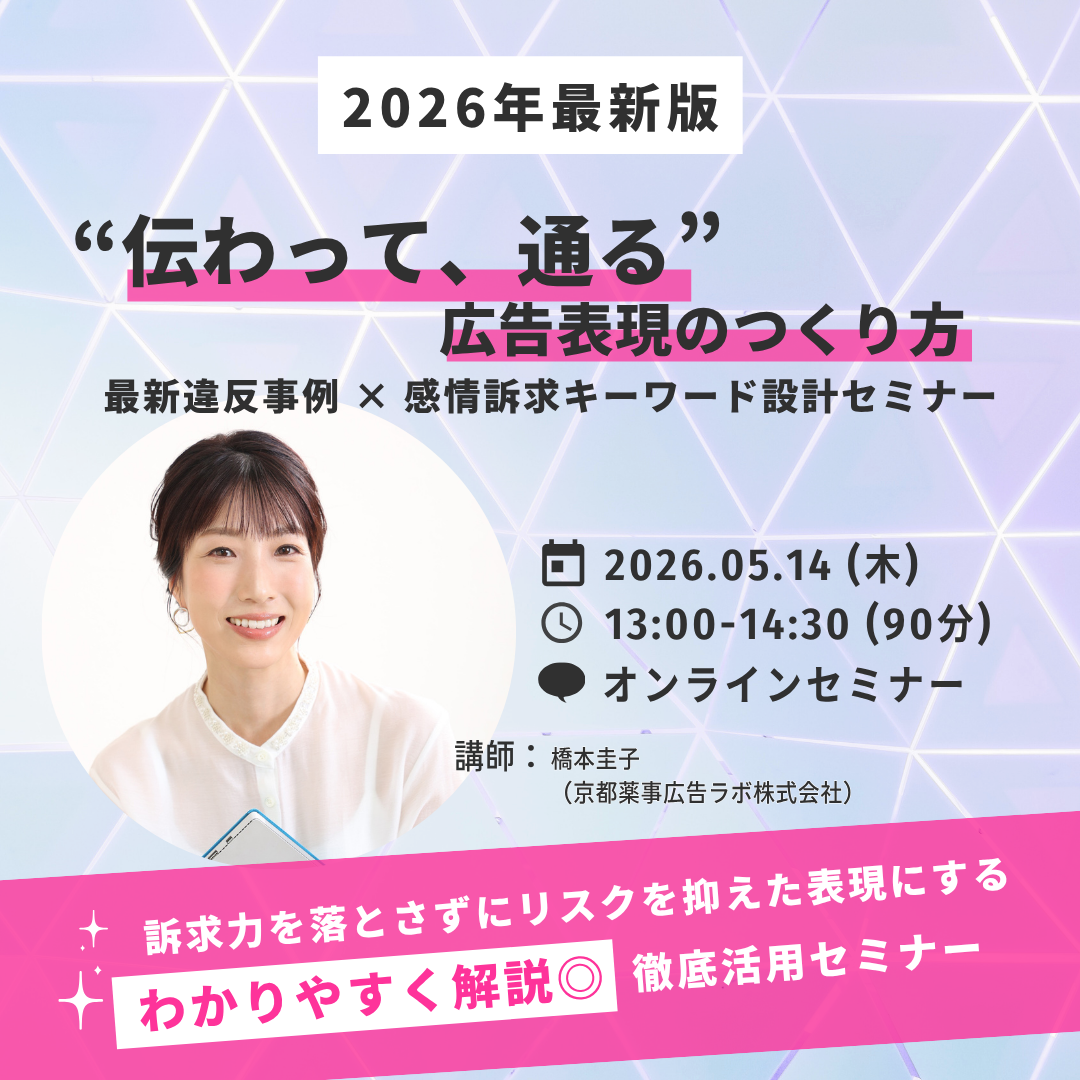 ※直近の違反事例をベースに、実務で使える形で解説します ■広告表現の「判断」と「訴求」、両立できていますか? 広告審査や表現設計の現場で、このようなお悩みはありませんか? この表現は通るのか判断に迷う NG理由をうまく説明できない 安全に寄せすぎて訴求が弱くなる 表現の修正や差し戻しが多い 本セミナーでは、最新の違反事例をもとに「なぜNGなのか」だけでなく、“どうすれば伝わりながら通るのか”という設計視点で解説します。 ■セミナーの特徴 ①最新の違反事例から判断軸を整理 直近の事例をもとに、問題となる表現の傾向と考え方を解説します。 ②「通る表現」の設計パターンがわかる NG→OKの考え方を整理し、再現性のある判断軸をお伝えします。 ③感情訴求キーワード設計を体系化 季節や消費者心理に基づき、伝わる表現の作り方を解説します。 ④質疑応答(リアルタイム) 講義内容に関するご質問はもちろん、日々の業務でお悩みの表現についてもその場でご質問いただけます。実務に即した形で整理・解説いたします。 ■このような方におすすめ 広告表現の審査・チェックに関わるご担当者様 薬機法・景表法リスクを適切にコントロールしたい方 訴求力とコンプライアンスの両立に悩んでいる方 社内での説明・判断力を高めたい方 ■参加メリット 判断基準が明確になり、迷いが減る NG理由を論理的に説明できるようになる 訴求力を落とさずに通る表現が設計できる 広告修正・確認の工数削減につながる ■開催概要 日時:5月14日(木)13:00〜14:30 形式:オンライン(Zoom) 定員:5〜10名(少人数開催) 参加費:9,900円(税込) ※セット割(同一企業内2人以上):5,500円/人 ※定員に達し次第、受付を終了いたします※同業の方のご参加はご遠慮いただく場合がございます ■お申込み方法 下記フォームよりお申込みください。お申込み後、参加費のお支払い方法をご案内いたします。 👉【申込フォームはこちら】https://forms.gle/siVsvjxb7V3MZP8L8 ■企業研修・カスタマイズのご相談 本セミナー内容は、企業様向けにカスタマイズした研修としての実施も可能です。 自社事例をもとにした研修を行いたい チーム単位で受講したい 広告チェック体制を強化したい などのご要望がございましたら、お気軽にご相談ください。 👉【お問い合わせはこちら】 ■講師プロフィール 薬事広告コンサルタント橋本圭子(京都薬事広告ラボ株式会社 代表取締役) 化粧品・健康食品分野を中心に、広告審査・表現設計を支援。企業向け研修・セミナー実績多数。 ■最後に 広告表現は「守る」だけでなく、伝えるために設計するものです。 本セミナーが、現場で迷わず判断できる状態づくりの一助となれば幸いです。