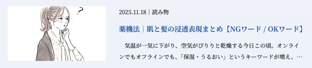 気温が一気に下がり、空気がぴりりと乾燥する今日この頃。オンラインでもオフラインでも、「保湿・うるおい」というキーワードが増え、乾燥対策にフォーカスした広告やコンテンツが増えてきました。今回は、薬機法ビューティエディターとして活動する筆者が、薬機法(旧薬事法)における浸透の範囲をおさらいし、NGワードを含めたルールの解説と、広告表現の注意点をわかりやすくご紹介します。  ECメディアが行うピックアップページ、インスタグラムやX(旧Twitter)によるインフルエンサーのPR、メーカーやブランドが展開する保湿アイテムの訴求テキストなど、多岐に渡る広告ページを正しくカバーするために。“スキンケア、ボディケアに適した浸透表現”を、特例としてチェックしておきたい“髪の浸透表現”とあわせてピックアップしました。 肌・スキンケアの保湿、うるおい表現  スキンケアに用いる浸透表現は、薬機法に抵触する“うっかりパターン”が多いため、慎重な言葉選びが求められます。肌へのうるおい表現の主なルールとして、化粧品(化粧水・乳液・美容液・クリーム・シートマスクなど)が作用し届くのは、角質・角層までの範囲。原則として、表皮の基底層や真皮など、奥の層まで浸透するかのような言い回しはNGです。会話でのアプローチやテキスト説明、使用感とコメント、ビジュアル演出も同様に、「角層の奥まで」「肌の奥まで」という表現は避ける必要があります。  また、景品表示法の観点では、「今までの美容液全部捨てた!」といった誹謗比較に該当する言い回しや、「1週間で肌が生まれ変わる!」などと謳うおおげさなキャッチコピーもチェックの対象です。PR案件や商品口コミ、レビューは、ユーザーにとって身近な体験談を聞くことができる貴重な訴求コンテンツなので、しっかりと言葉を整え広告に活用したいところ。 NGワード一覧 肌の内側に届く 乾燥肌を改善 真皮層まで浸透(承認済み薬用化粧品のみ可) うるおいが100時間持続 他にはない唯一のうるおい効果 OKワードのヒント 角層のすみずみまで 気になるカサつきをケア 肌に行き渡る ※角層まで うるおいが心地よく持続 うるおいに満ちた肌感に  ブランドの世界観を壊さず、読み手の気持ちに寄り添う“音感”や“情緒”を持たせることもポイントです。たとえば、リズムや響きのある言葉選び、やわらかな単語の組み合わせ、媒体のムードに沿うトーンや語彙。私自身、こうしたニュアンスを丁寧に紡いだ、正確さと美しさを両立する文章作りを意識しています  体・ボディケアの保湿、うるおい表現  パーツごとに多彩な関連商品が紐付けられている、体という大きなカテゴリ。保湿を担うアイテムも、ボディウォッシュ、ボディオイル、ボディクリーム、バスエッセンスなどがあり、パーツ別にカテゴライズすると、ハンドケア、ネイルケア、かかとケア、デリケートゾーンケアなど、目的や使用部位に応じたプロダクトが豊富に存在しています。  肌への浸透表現は、スキンケアと同じく角質層(角層)までが基本。さらに押さえておきたいのが、ラインナップ範囲が広いボディケア製品に多い、“付加価値の訴求”にまつわる表現です。「疲れを癒しリフレッシュ」「不眠を解消するリラックス効果」「ストレスを緩和」「低刺激で安心」「血行促進」など、医薬品的作用や改善が得られるかのような、本来の機能を超えた副次的効果を想起させる、インパクトを重視したNGワードが散見されます。 NGワード一覧 アロマセラピーで疲れを忘れる 疲労を取り除きリラックス 赤ちゃんにも使えて安心安全 バスエッセンスでデトックス 温浴効果でストレスを打破 OKワードのヒント 香りを楽しめるボディケア 心までほぐれるような芳香 やさしい使い心地 バスエッセンスでご自愛時間を 気持ちを切り替えたいバスタイムに  香りやテクスチャー、使用シーン、パッケージ、植物由来成分など、保湿効果とともに伝えたいアピールポイントはたくさんあります。香りがもたらす情緒的な表現や使用感、心地よさなど、情報やワードを正しく整えながら、商品の魅力を余すことなく引き立てる言葉選びを意識してみてはいかがでしょう  髪・ヘアケアの保湿、うるおい表現  ヘアケア製品は、毛髪と頭皮を清浄するシャンプーなどの“落とすケア”と、髪のうるおいや油分を補い保つヘアトリートメント&ヘアコンディショナー、ヘアオイル、ヘアミルクなどの“与えるケア”に大きく分類されます。保湿に加え、ハリやコシ、切れ毛、枝毛、帯電防止にも訴求範囲が広がる、プロダクトが持つ強みや特徴を伝えやすいカテゴリです。  浸透表現に関しては、肌のうるおい表現ではNGとされる「内部まで保湿」という表記がOKに。「髪の内側に浸透」「芯までうるおいを届ける」などの標榜が可能となります。ただし、毛髪の約85%を占めるコルテックスや、髪の中心に位置するメデュラなど、髪組織へのアプローチを名称とともに記載す