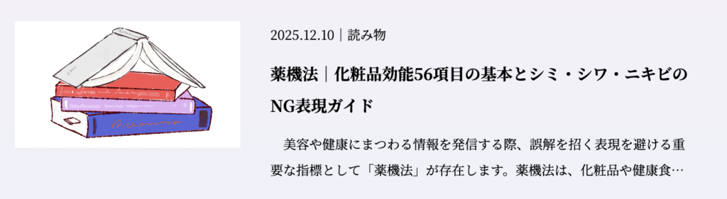 美容や健康にまつわる情報を発信する際、誤解を招く表現を避ける重要な指標として「薬機法」が存在します。薬機法は、化粧品や健康食品など生活に身近なアイテムから、医薬品や医療機器といった専門的な分野まで、医薬品等すべての品質・有効性・安全性を守るべく定められた法律です。  広告の規制では、虚偽誇大広告の禁止、効能効果保証広告の禁止などがあり、この規定は販売元や企業はもちろん、インフルエンサーやアフィリエイターなど個人の発信にも適用される指針として関わっています。  その広告基準を遵守するために、なじみの深い化粧品と医薬部外品にフォーカスしたものが「化粧品等の適正広告ガイドライン」です。この中には、実際に広告やPRを行う際の具体的な判断の目安として、化粧品の効能範囲をわかりやすく設定した56の項目があります。この項目は、化粧品で“言えること / 言えないこと”の軸となる、企画・制作・発信に携わるすべての人に向けた言葉のルールです。  今回は、この56項目の中でも特に間違えやすいポイントとNG例を取り上げ、正しい表現選びに役立つ薬機法の基本と注意点をお届けします。 もくじ ■ 化粧品の効能範囲を設定した56の項目について■「記載の可否」だけに留まらない、ルールと注意点■ ありがちな間違いとNG例を解説 ∟<シミ> 項目:日焼けによるシミ、そばかすを防ぐ ∟<シワ> 項目:乾燥による小ジワを目立たなくする ∟<ニキビ> 項目:(洗浄により)ニキビ、あせもを防ぐ 化粧品の効能範囲を設定した56の項目について  一般的な化粧品は、「人の身体を清潔にし、美化し、魅力を増し、容貌を変え、又は皮膚もしくは毛髪を健やかに保つために、身体に塗擦、散布その他これらに類似する方法で使用されることが目的とされる物で、人体に対する作用が緩和なもの」を指し、スキンケアやメイク用品、ボディケア、ヘアケアなど、日常に寄り添いながら穏やかに楽しめるビューティプロダクトが該当します。治す、改善するかのような治療表現や、薬用化粧品のような“効能効果”の記載は基本的に認められず、以下56項目の範囲内でのみ標榜が可能です。 ・事実であれば標榜可能 → 範囲を超える表現はNG  ・逸脱しない言い換えはOK・使用形態が限られている項目に注意  医薬部外品(薬用化粧品)は特別に認められている表現があり、一般化粧品では記載できない効能効果の項目が設けられています  「記載の可否」だけに留まらない、ルールと注意点  化粧品効能範囲56項目で注意したいのは、“文言どおりに書けばOK、どの化粧品でも標榜OK”ではないということ。56項目に該当する表現であっても、記載方法や組み合わせによっては効能効果の逸脱と判断されるリスクがあります。表記ルールは守っているか、メイクアップ効果と混同していないか、使用形態は適切か ── などを確認し、誤った情報や医薬品的な印象を与えない繊細な書き分けが求められます。  特に間違えやすい項目が、シミ・シワ・ニキビに関する広告表現です。化粧品効能範囲に表記されている使用可能な文言ですが、ルールを見落とすと薬機法に抵触する可能性が高まります。ポイントは、56項目に“当てはまるか”ではなく、“外れていないか”を見極める視点。言葉の意図を理解することで大げさにならず単調にもならない、的確な言い換え表現を見つけることができます。 ありがちな間違いとNG例を解説 <シミ> 項目:日焼けによるシミ、そばかすを防ぐ  一般化粧品で認められているのは、「日焼けによるシミ・そばかすを防ぐ」こと。 肌改善やシミを薄くするなどの表現は美容医療・薬用領域となり、隠すなどの視覚的な変化はメイクアップ効果に留まるので線引きがとても重要です。また、シミやそばかすに言及できるのはUVカット効果のある日焼け止め(紫外線吸収剤または紫外線反射剤が配合されている製品)や、物理的に陽射しを遮るUVカットマスクや帽子などに限られます。 ☑️ ありがちな間違いと注意点 スキンケアの文脈でシミに触れてしまう・シミが目立たない透明感のある肌へ・シミが気にならない明るい肌へ導く美容液・くすみもシミも保湿効果で集中ケア一般化粧品で美白効果や作用を説明してしまう・ビタミンCでシミ予防・ナイアシンアミドで美白習慣・シミに先回りしてブロック POINT UVカットなしの化粧品:“シミ・そばかす”についての標榜は基本的に不可 UVカット製品:“日焼けによる”を省いて記載することはNG 美白訴求:美容医療・医薬部外品(薬用化粧品)領域のためNG 参考:F4.5 効能効果のしばり表現   E15.1 薬用化粧品(医薬部外品)における美白表現の範囲   E15.2 メーキャップ効果に基づく美白表現の範囲出典:日本化粧品工業連合会 化粧品等の適正広告ガイドライン <シワ> 項目:乾燥による小ジワを目立たなくする  一般化粧品で扱えるのは、「乾燥による小ジワを目立たなくする」のみ。シワを薄くする、シワに直接アプローチするなどの表現は美容医