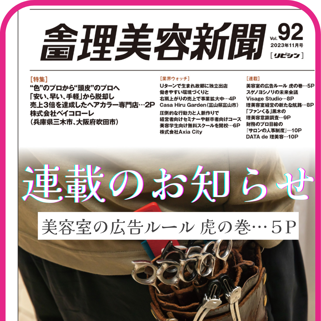 10月25日発刊の「全国理美容新聞」第92号(2023年11月号)にて、コラム連載が掲載されました。 〇コラムテーマ〇 美容室の広告ルール 虎の巻 今回のテーマは、「10月から規制スタート!ステマ規制からサロンを守る方法」です。 (隔月連載で、今回が最終回です!) お客様に自店の口コミ投稿を依頼したり、SNS投稿キャンペーンをする際は要注意です。 広告とみなされるにも関わらず、広告であることが分からない投稿などはステマ(ステルスマーケティング)といわれ、 景品表示法で規制されるようになりました。 キャンペーン施策や目的に応じて、お客様へ広告であることが分かる表記をしていただく必要があります。 例えば、Instagramだと「タイアップ投稿」であることを示すことも容易になりましたね😊 なんとなく知ってはいるけど…とうやむやにして経営を続けることはリスクがあります。 景品表示法違反を避けるためにも、正しい広告表示ルールを知っておく必要があります。 お客様から選ばれ続けるお店は、お客様にとって誠実なお店。 気になる方はぜひ、本コラムが掲載されている全国理美容新聞をお手に取ってみてください! 全国理美容新聞 第92号(2023年11月号)のご購読はこちらから