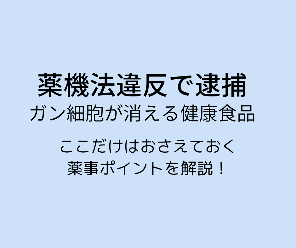 「腫瘍に効く」と医療機器販売会社社長ら4人逮捕 ただの飲料水を「腫瘍に効く」「アトピーの予防効果」などの効能効果をうたい 医薬品として無許可販売した疑いで、4人が逮捕されました。 先月にも「がん細胞が消える」とうたい 健康食品を販売した会社の代表格が逮捕されたばかりです。 このニュースの注目ポイント 医薬品医療機器等法(薬機法)の違反による逮捕(未承認医薬品) ウェブサイトに「お客さまの声」として、「がんが治った」などと掲載 全国の1300人余りに販売し、6年間でおよそ3,200万円を売り上げていた。 またか!というのが第一印象ですが、 やはりこのようなニュースは氷山の一角であることが予測されます。 地下水に海洋ミネラルを混ぜた「高機能飲料水」として販売していたということですが、 警視庁が鑑定したところ、一般的な飲料水と成分は変わらなかったということです。 調べに対して、容疑を認めているとのことです。 つまり、何の効果もないと分かっていながらただの水を高額で販売していたということです。 腫瘍やアトピーに悩む患者様の弱みに付け込んだ卑劣な犯罪だと考えます。 医療機器販売会社でありながら、健康を害す販売行為を行うこと自体に疑問しかありません。 身体的・精神的被害、金銭的被害に遭われた被害者の方には 適切に補償まで行き届くことを祈っています。 ちょっと怒りが収まらないので、これまでにもあった「水」の事件をおさらいしましょう。 水の違反事例 水素水の違反事例 【2017年6月27日】食品スーパーなどを展開するジャパンミートは自社と従業員3人が薬機法違反容疑で書類送検 清涼飲料水の「水素水」の販促物で 「癌や動脈硬化に効く」「悪玉活性酸素を排出」などと表示して販売していた。 飲料水の違反事例 【2014年8月】長野県警は医薬品的な効果効能をうたった飲料水「強命水 活」を販売していた エーイーエムの社長ら3人を旧薬事法違反で逮捕。 商品「強命水 活」自体には、効果効能は示されておらず、 効能に触れた体験談の資料を同梱するのも違反となるため行われていませんでしたが、 検索サイトで『諏訪 不思議な水』と検索すると、 「体験談やモニター情報がご覧になれます」と誘導される仕組み。 そして『諏訪 不思議な水』とインターネットで検索すると、商品名は出てこないものの、 効果効能をうたった体験談のサイトが出てくるようになっていました。 この一件から、「検索による誘導」を“リンクと同等”とみなし、広告に該当するものと判断されるようになった。 体験談のサイトでは、医薬品的な効果効能をうたっているため、 薬機法違反(未承認医薬品の無許可販売)とされた。 「病気が治る魔法の水は存在しない」と平時では理解しているつもりですが、 心配事や藁にもすがる思いから手を伸ばしてしまうものです。 このような背景もあいまって、薬機法は今後もより厳しい目で取り締まられることでしょう。 少しでも不安に思われる方、アドバイスが欲しいという方はお気軽にご相談くださいませ。 ☚こんな薬事相談先が欲しかった! 文字数カウントや回数を気にせずに相談したい チャットなどでスピーディーに相談したい セカンドオピニオンが欲しい