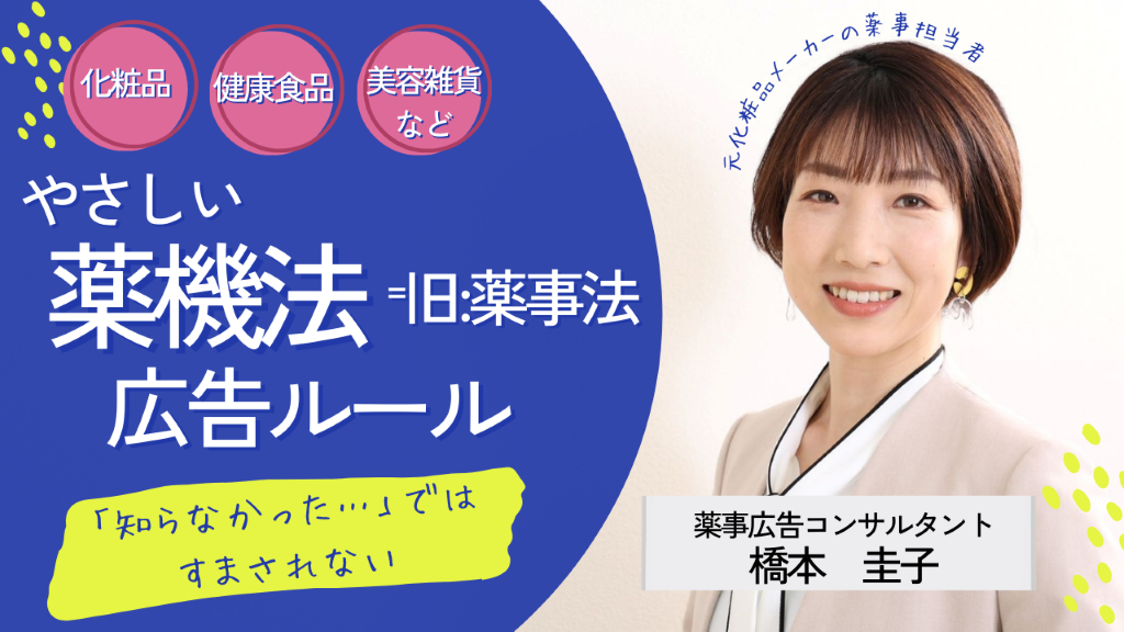 安心してください!薬機法のことゼロからお伝えします。 薬機法(=旧薬事法)の正式名称は、「医薬品、医療機器等の品質、有効性及び安全性の確保等に関する法律」です。 以下の5つのカテゴリーが対象です。 医薬品 医薬部外品 化粧品 医療機器 再生医療製品 一言でいうと、 私たちの安全や健康が守られるための法律です。 そのため、私たちが適切に薬を選んだり、病院へ受診することを阻害するような行為は許されません。 薬機法では「広告」に関して規制しています。 (誇大広告等)第六十六条 ※一部抜粋何人も、医薬品、医薬 部外品、化粧品、医療機器又は再生医療等製品の名称、製造方法、効能、効果又は性能に関して、明示的であると暗示的であるとを問わず、虚偽又は誇大な記事を広告し、記述し、又は流布してはならない。 2 医薬品、医薬部外品、化粧品、医療機器又は再生医療等製品の効能、効果又は性能について、医師その他の者がこれを保証したものと誤解されるおそれがある記事を広告し、記述し、又は流布することは、前項に該当するものとする。 (承認前の医薬品、医療機器及び再生医療等製品等の広告の禁止)第六十八条 何人も、第十四条第一項、第二十三条の二の五第一項若しくは第二十三条の二の二十三第一項に規定する医薬品若しくは医療機器又は再生医療等製品であつて、まだ第十四条第一項、第十九条の二第一項、第二十三条の二の五第一項、第二十三条の二の十七第一項、第二十三条の二十五第一項若しくは第二十三条の三十七第一項の承認又は第二十三条の二の二十三第一項の認証を受けていないものについて、その名称、製造方法、効能、効果又は性能に関する広告をしてはならない。 医薬品、医療機器等の品質、有効性及び安全性の確保等に関する法律 端的にまとめると、以下について禁止されています。 ①嘘やおおげさな広告 ②国が承認していない製品の広告 違反した場合、 課徴金 措置命令 行政指導 刑事罰 書類送検 … など、罰則等が設けられています。 何より、薬機法違反のレッテルをはられてしまい、風評被害のほか、ネットニュースなどで半永久的に社名等がネガティブな内容とともに残ってしまうため、ダメージは計り知れません。 「知らなかった…」ではすまされないため、美容健康に関わる広告は正しい配慮が求められます。 少しでも気になることがあったら、専門家へ相談されることをおすすめします。 専門家への相談はこちら