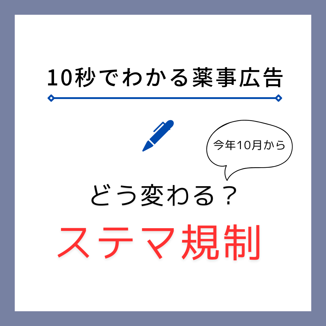 2023年10月1日より「ステマ」が規制されるようになります。 なんとなく「ステマ規制」が騒がれているなとお感じではないでしょうか。 現代ではインフルエンサーをはじめ、様ざまな立場の方に対して 「良いレビューを書いてほしい」「SNSで〇〇社の商品がおすすめと言ってほしい」などとお願いされる案件が増えています。 依頼する側も(広告主)依頼される側も(第三者)「ステマ」に該当しない、させないためには最低限これだけは理解しておきましょう! 参考:景品表示法とステルスマーケティング~事例でわかるステルスマーケティング告示ハンドブック~ ステルスマーケティングとは まず、「広告であるにもかかわらず、広告であることがわからないもの」いわゆるステルスマーケティング的な投稿やブログなどについては…→「広告であることを明瞭に示すこと」が義務となります。 広告であることを明瞭にする そして、上記の広告にあたるかどうかは、「広告主が投稿(表示)内容に関与しているか」が焦点となります。 広告主(依頼主)が内容に関与していれば、広告とわかる表記が必要です。 広告とわかる表記=「#広告」「プロモーション」「PR」「〇〇社より商品提供を受けています」等を目に留まる場所・色で表記する 一方、広告主(依頼主)が内容に関与しておらず、依頼された方(第三者)による自主的な投稿や口コミ・レビューと判断できれば広告等の表記は不要です。 表示内容に関与しているかが重要 今年10月以降は、その思考回路を持っていないと、危うく不当表示と認定され景品表示法規制の対象となりますのでご注意ください。 広告であることを隠しているとステマに 化粧品や健康食品のPR方法は多岐にわたり、ケースバイケースになることが予想されます。 ご自身で判断が難しい、心配だという方はぜひご相談いただければと存じます。 専門家への相談はこちら