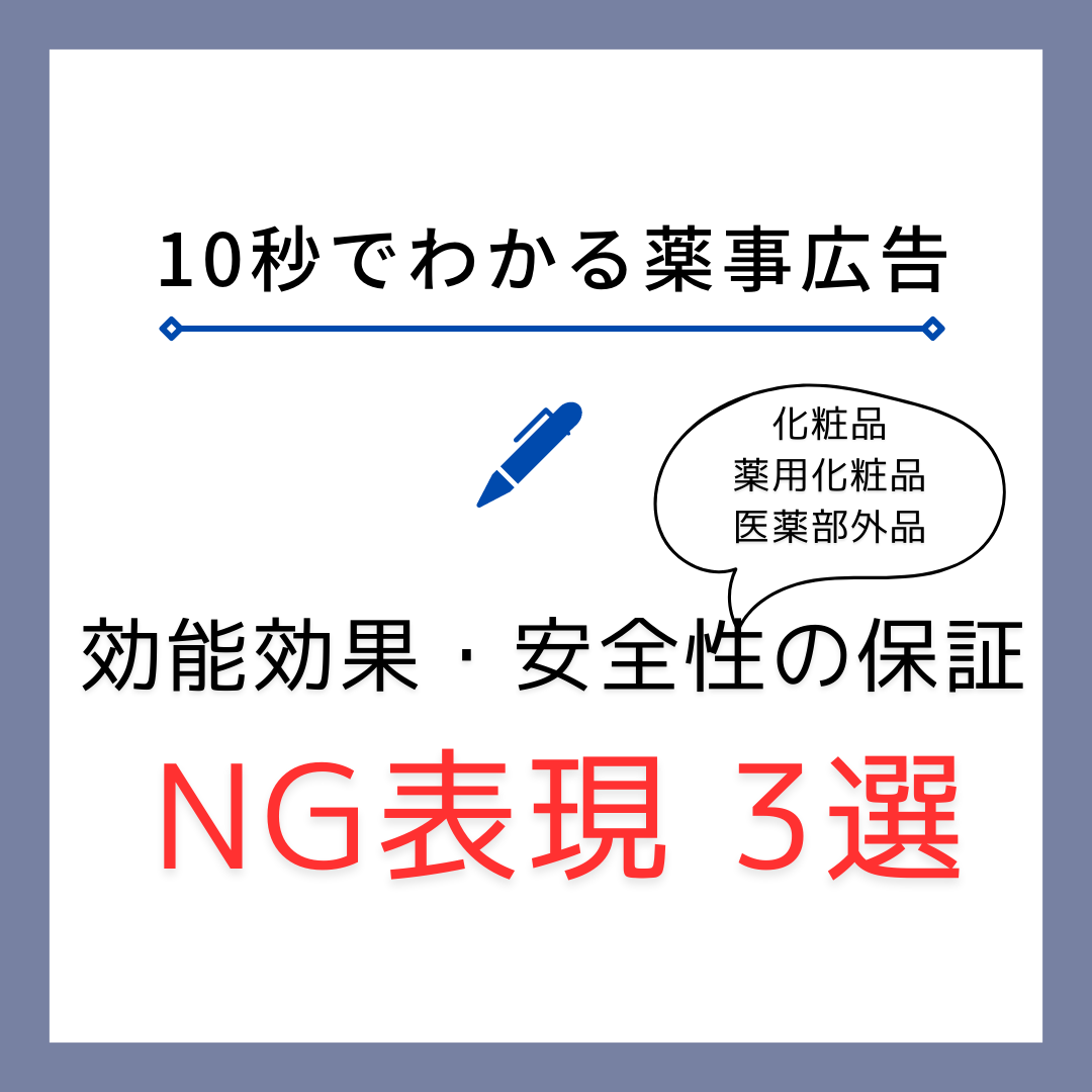 化粧品等の広告ルールでは、「効能効果または安全性の保証」が禁止されています。 ・誰に対しても確実に効果がある ・どんな人が使っても安心安全 消費者に対し、そういった誤認を与えないためとされています。 効能効果または安全性の保証となる表現をすると、「誇大広告」と見なされる可能性が高くなるので要注意です。 そこで、今回は効能効果または安全性の保証表現に該当してしまうNG表現を3つ選びました。 臨床データや実験例等の例示 使用体験談 キャッチコピー等の強調表示 ≪NG ≫臨床データや実験例等の例示 たとえ客観的で確実なデータや実験データを保持していたとしても、それを広告に使用することはできません。 知識量の少ない消費者にとってはかえって説明不足になり、誤認を与えるおそれがあるためです。 一般向け広告にあっては、効能効果又は安全性に関する臨床データや実験例等を例示することは消費者に対して説明不足となり、かえって化粧品等の効能効果又は安全性について誤解を与えるおそれがあるため原則として行わないこと。 化粧品等の適正広告ガイドライン F7.1 臨床データや実験例の例示 臨床データ?実験例って何を指すの?と思われる方も多いと思います。 ◇臨床データとは、効能評価試験等の結果や安全性パッチテストの結果 ◇実験例等とは、比較実験および通常の使用方法以外での試験 このように理解いただければと存じます。 ≪NG≫使用体験談 使用体験談(愛用者の感謝状、口コミレビューの引用など)には、効能効果や安全性に関わるコメントを掲載して広告してはならないとされています。 使用体験談で認められるのは、以下の内容に限られます。 使用方法 使用感 香りのイメージ せっかく体験談をいただいたのに、載せられない…とお悩みの方も多いかと思いますが、いただいたコメントから効能効果と安全性に関する部分を削除して掲載する程度は許容範囲とされています。 逆に、感想の内容を指示することは不適切であり、作為的とみなされるため避けた方がよいと考えます。 効能効果や安全性に関するコメントを掲載しながら、 ※個人の感想です。※効果には個人差があります。 といった打消し表示をしても、免罪符にはなり得ませんのでご承知おきください。 キャッチコピー等の強調表示 効能効果や安全性に関しては、強調すると保証表現と見なされます。 例えば、 効果を実感 すぐれた効果 安心安全 このようなフレーズをキャッチコピー等で強調表示すると保証表現となります。 広告を制作している際は、効能効果や安全性が他よりも強調されて表示されていないかを確認するようにしてください。 以上が、効能効果および安全性の保証表現になる3選でした。 参考:化粧品等の適正広告ガイドライン | 日本化粧品工業会 (jcia.org) 化粧品の広告でお悩みの方はお気軽にご相談くださいね。 ☚こんな薬事相談先が欲しかった! 文字数カウントや回数を気にせずに相談したい チャットやLINEでスピーディーに相談したい セカンドオピニオンが欲しい https://kyk-lab.com/works/1930/