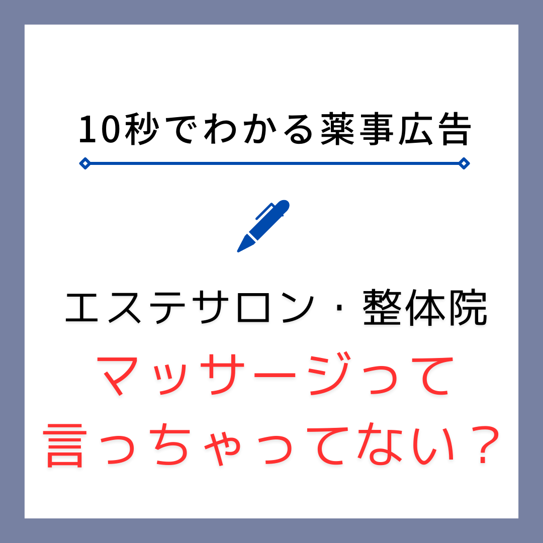 「マッサージ」をメニューにして報酬を得るには国家資格が必要! 日常でも口にする「マッサージ」という行為。 実は法的にマッサージは治療行為に位置付けられており、 医師やあんま師、理学療法士など国家資格を保持する方々の職域とされています。 つまり、資格なしにマッサージをサービスとして提供することはあはき法や医師法の違反となります。 あはき法とは、 あん摩マッサージ指圧師、はり師、きゆう師等に関する法律です。それぞれの仕事の頭文字を取って、通称あはき法と呼ばれています。昭和22年に定められた法律。 あはき法の内容は、医師以外の者が、あん摩、マッサージ又は指圧、はり、きゆうを行う場合はそれぞれ免許が必要であるというものです。マッサージは医療に類似する行為なので、厚生労働省の定める基準をクリアした者しかできないということになっています。 厚生労働省からも、資格のないものがマッサージ等の医業類似行為を行わないように注意喚起を行っています。 医業類似行為に対する取扱いについて|厚生労働省 (mhlw.go.jp) では、マッサージはどう言い換えればよい? マッサージと称してメニューを掲げちゃってるよ、、、という方は、 下記のように言い換えをおすすめします。・リラクゼーション・トリートメント・癒し・ほぐし※サービスの内容が治癒治療を目的にしていないことが大前提です。 エステサロンや整体院での施術の広告表現は、薬事法や医師法、 あはき法等複数の法規が絡んでいてルールが複雑です。 それに、根拠がない効能を標ぼうすると景表法違反にも問われます。 他にも気になる点がありましたら是非ご相談いただければと思います。 専門家への相談はこちら ☚こんな薬事相談先が欲しかった! 文字数カウントや回数を気にせずに相談したい チャットやLINEでスピーディーに相談したい セカンドオピニオンが欲しい