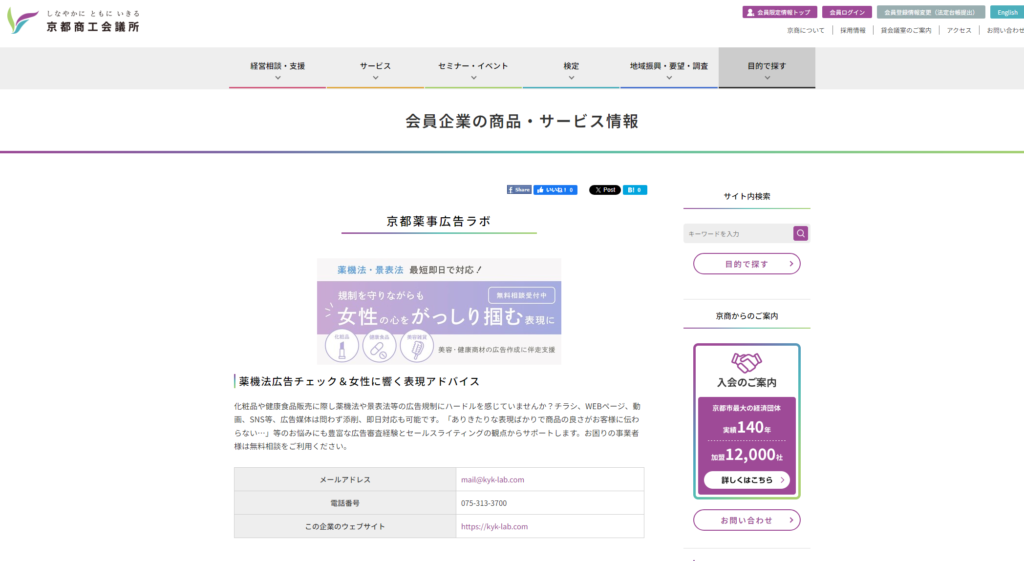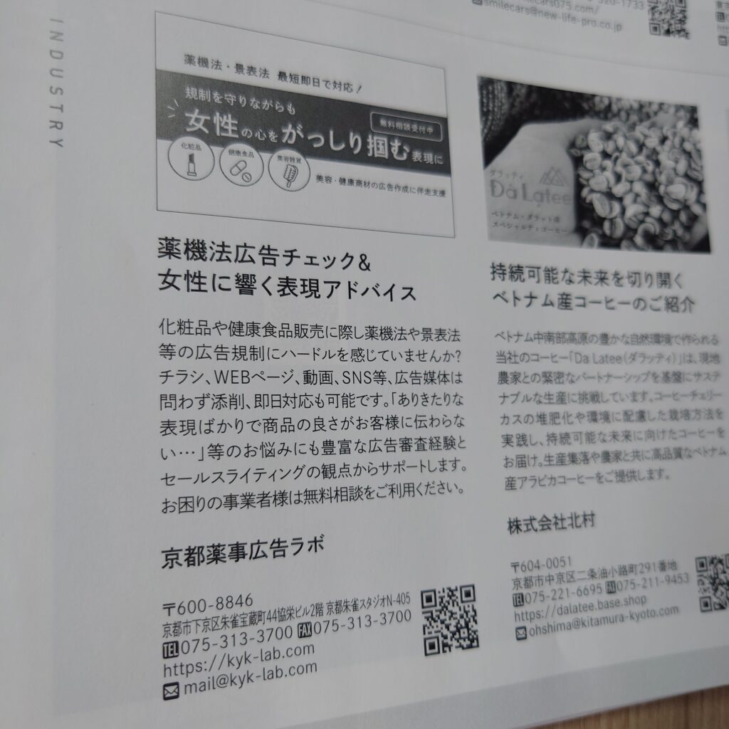 京都商工会議所の会報「BUSINESS REVIEW」Vol.781の 会員企業紹介ページに掲載いただきました。 WEB版でも掲載いただきました。 参照:京都商工会議所|VIVID KYOTO 京都薬事広告ラボでは、京都に限らず全国各地の企業様とお取引させていただいています。 ただ、地元企業の方や、京都に住んだことがあるというクライアント様とは京都という地に親近感を持っていただけます。 地元の話で盛り上がるのはビジネスでもあるあるですね。 屋号にも京都という言葉を入れているので、地元愛深めでこれからも頑張っていこうと思います。 薬機法など広告表現にお悩みの方はご相談ください。