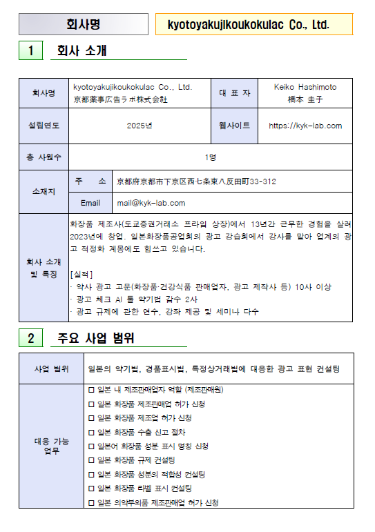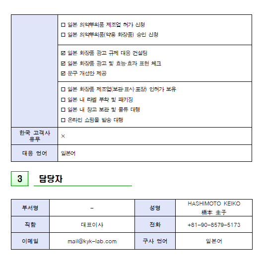 「本リストに掲載された代行機関は、韓国化粧品協会が公式に認定または推薦する機関ではなく、各会員企業におかれましては参考資料としてご活用ください。本案内を通じて協会が経済的利益を得ることはなく、代行機関との実際の業務進行時に発生する問題について、協会は民事・刑事上の責任を負いません。」