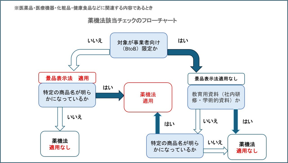 目次 BtoB広告における規制の基本概念 BtoB広告・資料の種類と特徴 薬機法vs景品表示法:適用判断の決定的な違い BtoB広告の法規制該当チェックフローチャート 薬機法適用外の場合の表現自由度とリスク 実務対策:教育用資料の位置づけと社内共有 よくある質問と回答 BtoB広告における規制の基本概念 BtoB(Business to Business)広告は、一般消費者向けの広告とは異なる規制適用の考え方が存在します。多くの企業が見落としがちなのが、「BtoBだから薬機法や景品表示法は関係ない」という誤解です。 実際には、BtoB広告においても薬機法の適用可能性があり、適切な判断基準を理解することが重要です。 なぜBtoB広告規制が重要なのか コンプライアンス違反のリスク回避 営業資料の効果的な活用 教育用資料の適切な管理 プレスリリースでの表現最適化 BtoB広告・資料の種類と特徴 BtoB向けの広告・資料には、以下のような種類があります。それぞれ異なる規制適用の可能性があるため、種類別の理解が不可欠です。 1. 営業担当者向け資料 特徴: 営業現場での商品説明に使用 技術的な詳細情報を含む 効果・効能の具体的な説明が必要 規制リスク: 高(薬機法適用の可能性大) 2. 販売店向け資料 特徴: 販売促進を目的とした情報提供 商品の差別化要素を強調 売上向上のための訴求ポイント 規制リスク: 高(薬機法適用の可能性大) 3. 業者向け資料 特徴: 卸売業者や流通業者向け 商品の流通・販売に関する情報 市場データや競合分析を含む 規制リスク: 中(内容によって薬機法適用の可能性) 4. 教育用資料 特徴: 知識習得や理解促進が目的 学術的・技術的な情報提供 販売促進が直接的な目的ではない 規制リスク: 低(適切な位置づけにより薬機法適用外となる可能性) 5. 報道機関向け資料(プレスリリース) 特徴: 企業の発表事項を報道関係者に提供 客観的な事実の伝達が中心 広く一般に公開される可能性 規制リスク: 高(薬機法適用の可能性大) 薬機法vs景品表示法:適用判断の決定的な違い 景品表示法の適用範囲 規制対象: 一般消費者向けの表示 BtoB広告への適用: 非該当 景品表示法は一般消費者の自主的かつ合理的な選択を確保することを目的としているため、BtoB広告は原則として規制対象外です。 詳細はこちら: 消費者庁「景品表示法の概要」 薬機法の適用範囲 規制対象: 薬機法の広告三要件を満たすもの BtoB広告への適用: 該当の可能性あり 薬機法の広告三要件 薬機法では、以下の3つの要件すべてを満たす場合に「広告」として規制対象となります: ①顧客誘引の意図が明らか 商品・サービスの購入や利用を促す意図 直接的な販売促進が目的 ②商品名が明らか 特定の商品・サービスが識別できる ブランド名や製品名の記載 ③一般人が認知できる状態 重要: 「一般人」とは「広告主以外の人」という広い概念 BtoB向けであっても、広告主以外が認知可能であれば該当 BtoB広告でも薬機法が適用される理由 「一般人が認知できる状態」の解釈が鍵となります。薬機法における「一般人」は、広告主以外の人を指すため、以下のような場合でも適用される可能性があります: 営業担当者が顧客企業に提示する資料 販売店に配布する商品説明書 業界関係者向けのプレスリリース BtoB広告の法規制該当チェックフローチャート Step 1: 資料の目的確認 質問: この資料は何のために作成されたか? 販売促進目的 → Step 2へ 教育・情報提供のみ → Step 3へ Step 2: 薬機法三要件チェック ①顧客誘引の意図はあるか? Yes → 次の要件へ No → 薬機法適用外 ②商品名は明確か? Yes → 次の要件へ No → 薬機法適用外 ③広告主以外が認知できる状態か? Yes → 薬機法適用あり No → 薬機法適用外 Step 3: 教育用資料の位置づけ確認 質問: 資料の位置づけは適切に管理されているか? 適切な管理 → 薬機法適用外 管理不十分 → 薬機法適用の可能性 判定結果に基づく対応 薬機法適用あり: 承認・認証・届出の範囲内での表現 虚偽・誇大表現の禁止 適切な根拠データの準備 薬機法適用外: 表現の自由度が高い ただし、虚偽・誇大表現のリスク管理が必要 薬機法適用外の場合の表現自由度とリスク 表現の自由度 薬機法の適用がない場合、以下の表現が可能になります: 効能効果の表現 承認の範囲を超えた効果の説明 実際の使用結果に基づく具体的な効果 安全性の表現 科学的根拠に基づく安全性データの提示 副作用情報の詳細な説明 事実の表現 臨床試験データの詳細な開示 競合製品との客観的比較 潜在的なリスク 虚偽・誇大表現のリスク 事実と異なる情報の提供 過度な効果の強調 根拠のない安全性の主張 情報伝達の阻害 過度な誇張による信頼性の低下 正確な情報伝達の妨げ 資料本来の目的の達成困難 二次利用のリスク 教育用資料の広告目的での無断使用 社内での位置づけの混乱 意図しない薬機法違反 実務対策:教育用資料の位置づけと社内共有 教育用資料の適切な管理 教育用資料は薬機法適用外となる可能性が高いものの、適切な位置づけと管理が不可欠です。 1. 社内での位